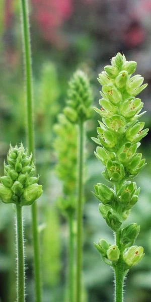 ‘Greenfinch’ produces masses of upright flower spikes during summer, each with a cluster of green tubular flowers. These imposing blooms are very popular with flower arrangers. Unusually the foliage of this Heuchera plays second fiddle to the flower, forming a low mound of evergreen, shallowly lobed green leaves.